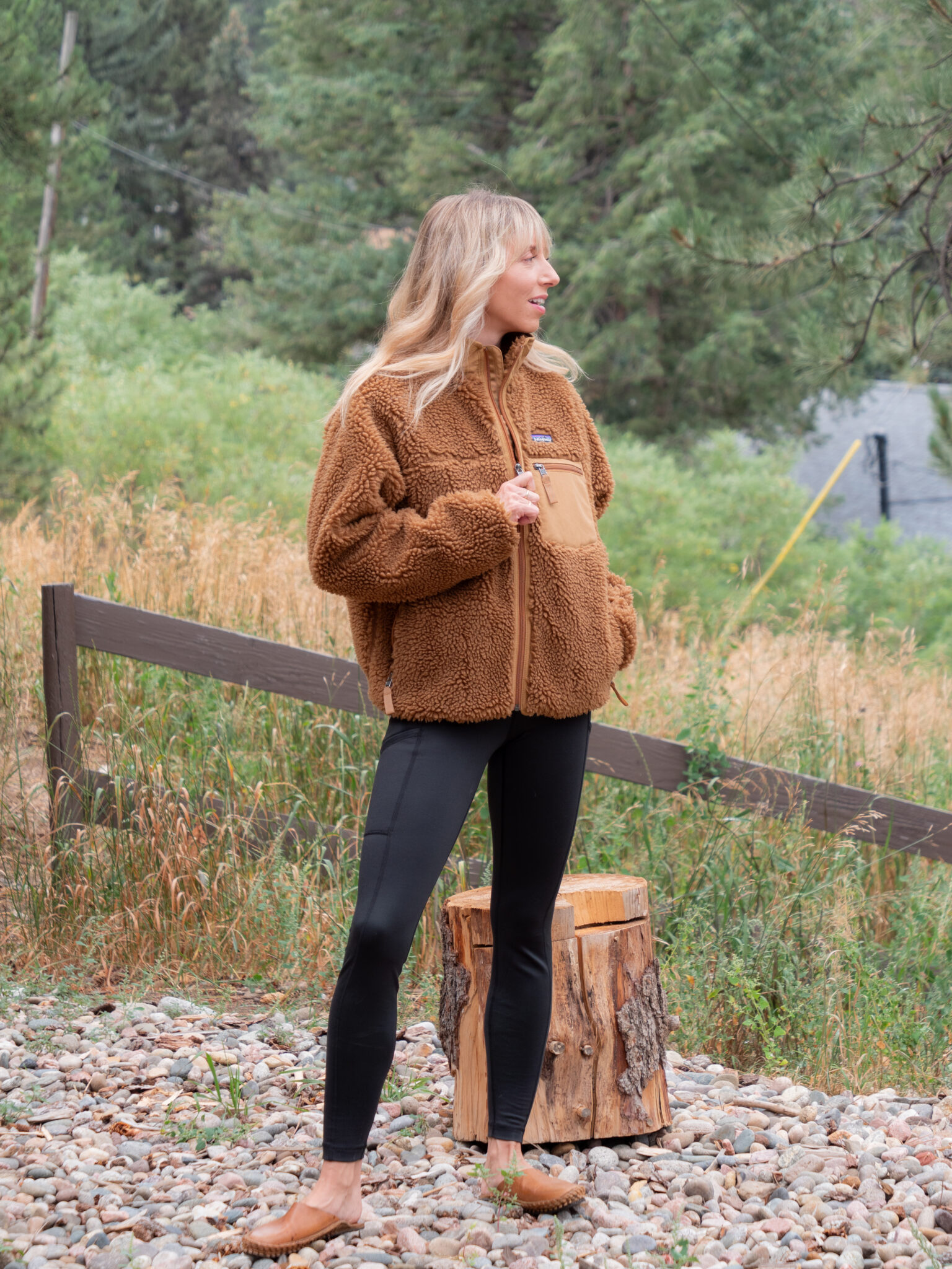Our Editor’s Review | “Living in Colorado, you see Patagonia everywhere. Their clothes are famous for being durable outdoor staples. They are made with high-quality construction, so they last a long time. I was excited to try their new and improved Classic Retro-X® Fleece Jacket. It’s a fresh design taken from their classic Retro-X fleece. They used 100% Repreve® recycled polyester certified by OceanCycle. The inside feels like a waterproof jacket, so you’d want a shirt underneath. The outside is fuzzy and cozy. Paired with their Pack Out Tights, I love the soft feel of these leggings, which are also made from recycled polyester. The pockets make them look like pants, so they’re great leggings for any adventure.”