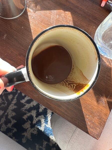 • Sunday. I sip my mud while my husband makes coffee, and I can’t say I miss the coffee much.