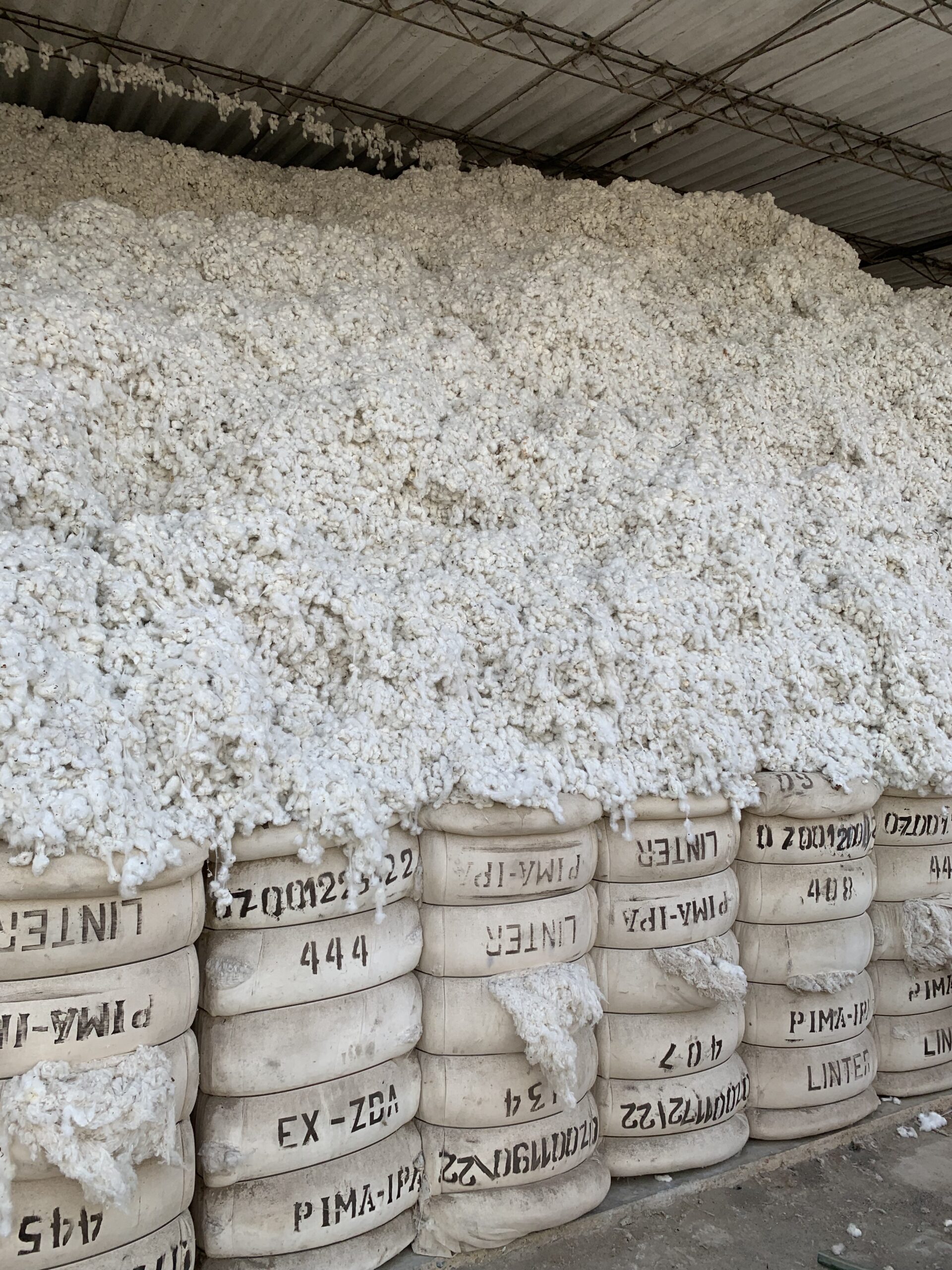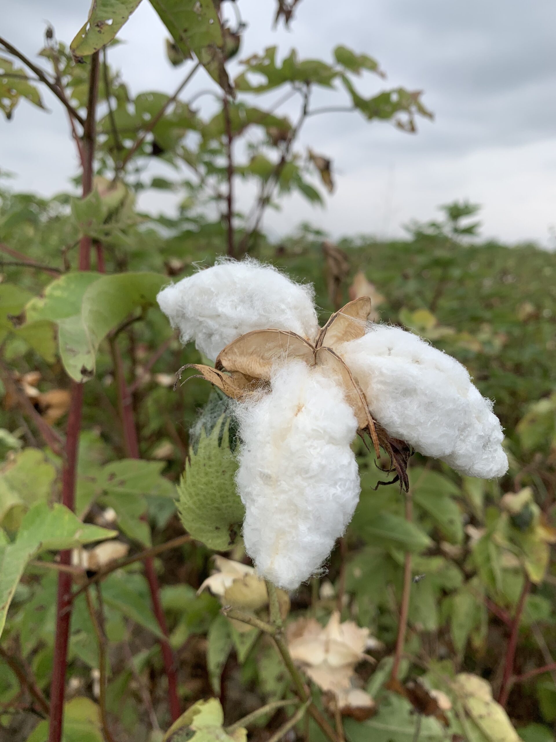 Surprisingly, it was difficult to see much of a difference between the ROC fields, the organic fields, and the nearby conventional farms unless you knew what to look for. But once we got up and close to the cotton, we noticed small things, like cut-up water bottles tied to wooden posts dispersed throughout the fields. These were filled with a sugar-like liquid to attract bugs and deter them from the cotton plants—an alternative to pesticides. With regenerative organic farming, some main differences are little to no tilling, using cover crops to keep the soil fertile, and intercropping.